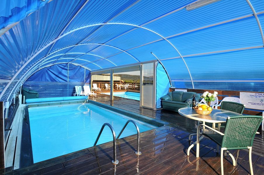 בחצר המתחם בריכת שחייה מחוממת ומקורה מול הנוף הפתוח מוקפת דק, פינות ישיבה, פינת מנגל, ערסלים, פרגולות עץ ומדשאות ירוקות.
